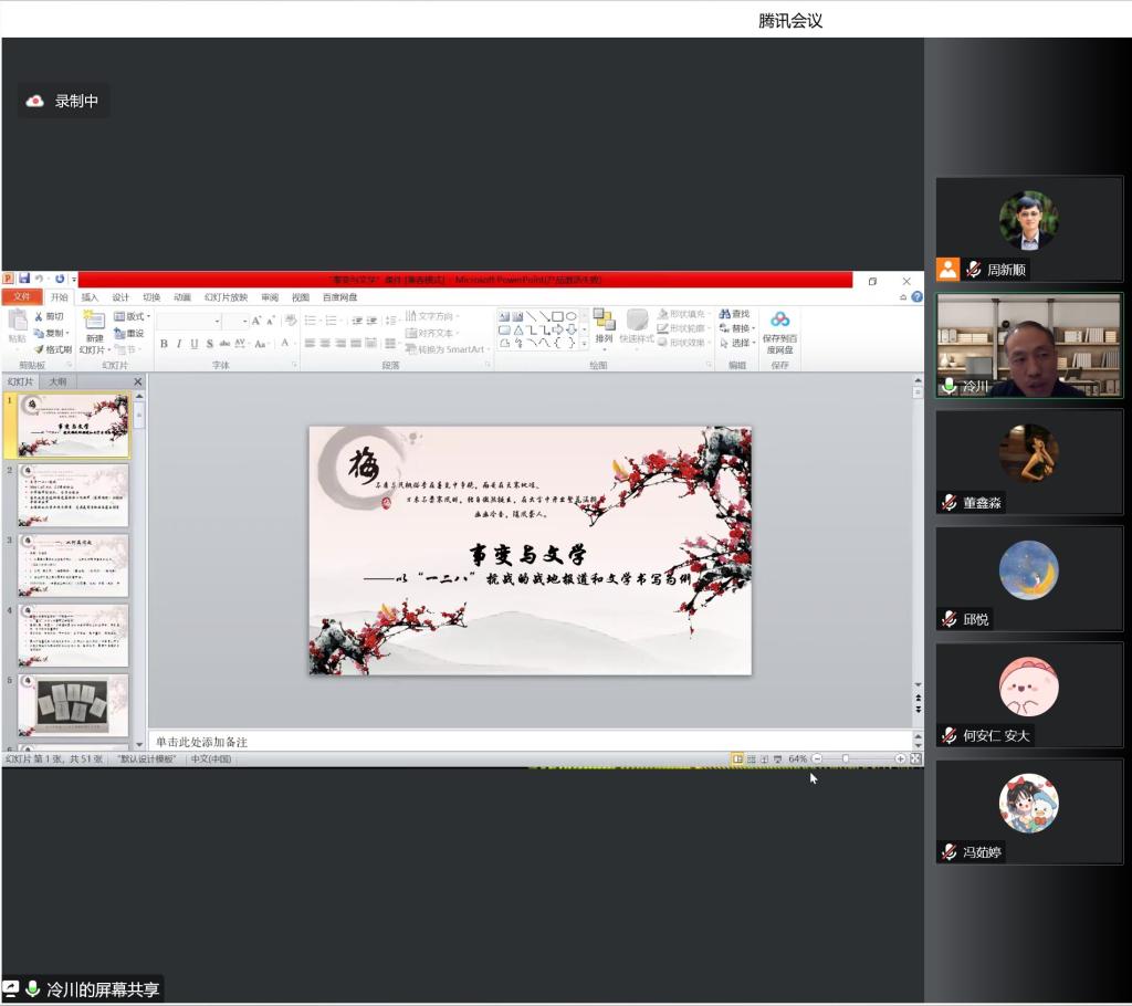 12月11日晚,中国社会科学院文学研究所现代室副研究员冷川应邀做客万博MAX体育官网名师大讲堂,通过腾讯会议线上平台,为万博MAX体育官网师生作了题为“事变与文学——‘一·二八’抗战的战地报道和文学反思”的学术报告。本次报告会由万博MAX体育官网周新顺教授主持,吸引了校内外百余人参与聆听。