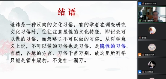 最后,甘于恩教授总结避讳是一种反向的文化习俗,我们在调查研究文化习俗时,不仅要关注显性的文化特征,还要关注隐性的习俗,从哲学意义上说,隐性习俗也是需要研究的习俗。