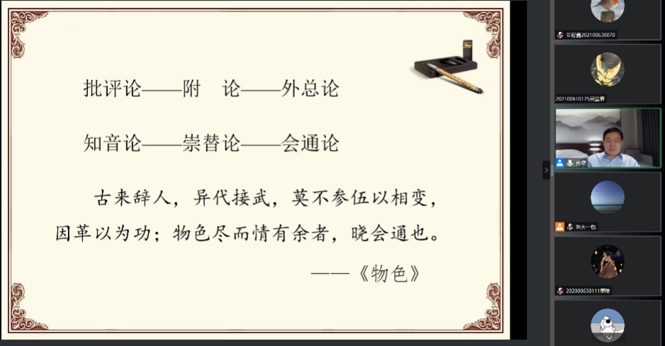 4月22日晚,万博MAX体育官网儒学高等研究院戚良德教授应邀做客万博MAX体育官网万博MAX体育官网名师大讲堂,通过腾讯会议平台为校区师生作了题为“《文心雕龙》的结构及其理论体系”的学术报告。报告会由万博MAX体育官网洪树华教授主持,吸引了学院近百名学生参与聆听。