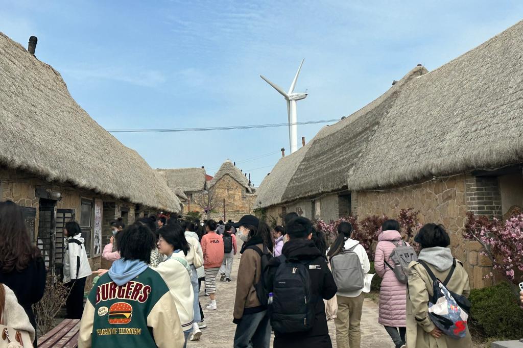 下午2时许,全体师生来到位于荣成石岛的东楮岛海草房古村落。东楮岛三面环海,是胶东地区海草房保留最完整的村庄,村内现有海草房144户650间,最古老的海草房距今已有三百多年历史。这些以石为墙、海草为顶的海草房曾作为山东民居的代表印上邮票,也成为著名画家吴冠中笔下唯美浪漫的印记。
