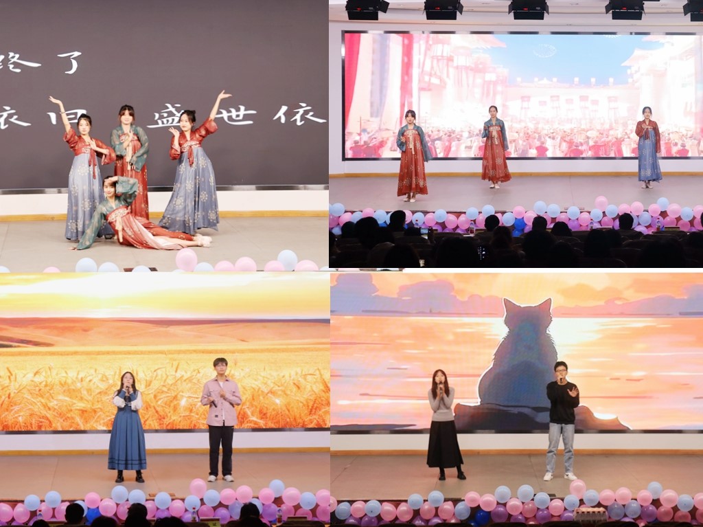 本次晚会共由十个节目组成,包含歌唱、舞蹈、朗诵、话剧等多种形式,旨在弘扬山大精神,展现青春风貌。新生辅导员白孟灵带领学生表演的开场舞《美人关》翩跹绰约,舞姿再现盛唐风采,尽显中华文化的灿烂夺目;由韩国留学生李在珍同学带来的武术表演《南拳》豪情万丈,伴随着激昂的乐声展现出中华传统武术自强不息的精神,诠释出跨文化交流的理念;串烧歌曲悦耳动听,真挚地诠释了爱与美的真谛;傣族舞《喜水》灵动柔美,舞者动人的舞姿与悠扬的乐曲配合,让全场观众仿佛置身于傣族村寨,身临其境地感受着民族文化的魅力;诗歌朗诵《青春中国》慷慨激昂,赞颂了美好新时代,传递出中国青年生逢其时大有作为的坚定决心;流行舞《我就是我》展现了坚定自我、勇敢做自己的青春态度;新编话剧《海的女儿》以“疑惑、追寻、领悟生命永恒”为线索,体现了大爱无边、善意永存的主题;快板《天安门广场看升旗》通过追忆战火里的革命故事,深情讴歌了革命先烈以青春捍卫理想的不朽气节;汉服走秀端庄温婉、衣袂飘飘,尽显泱泱华夏的千古风华;泮水合唱团带来的歌曲《花开忘忧》以清灵的歌声拂去游子心头的轻霾,感动着现场的每一位新生,给予他们勇敢逐梦的力量。