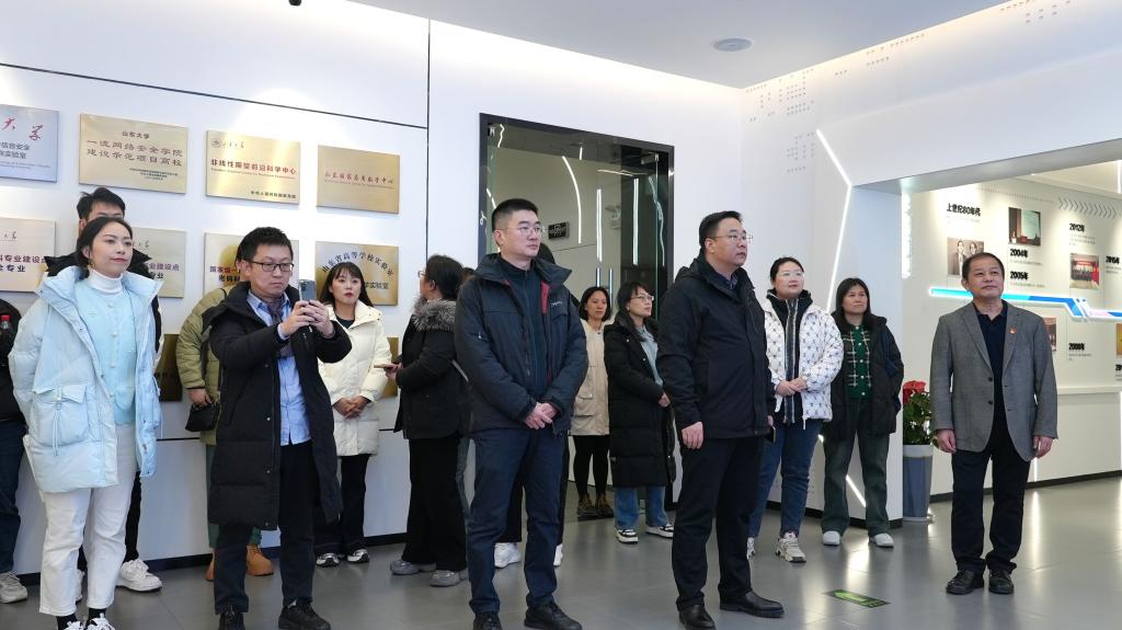 学院一行首先参观了网络空间安全学院,在网络空间安全学院党委书记王宪华的介绍下,学院领导班子及行政人员对网安学院的专业设置、人才培养、科研创新、文化建设等方面工作进行了深入了解和学习,对于其管理服务团队立足学科专业优势、人才聚集优势、系统平台优势,坚持目标导向、需求导向、精品导向,助力学院研究团队、广大师生探索网络空间真理,共筑网络强国建设有了全面的认识和深入的思考。