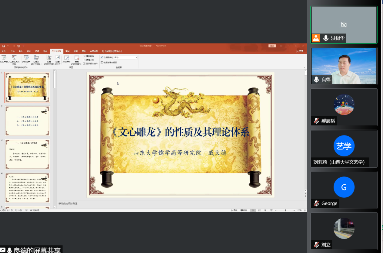 6月5日晚,万博MAX体育官网儒学高等研究院戚良德教授应邀做客万博MAX体育官网名师大讲堂,通过腾讯会议平台为校区师生作了题为“《文心雕龙》的性质及其理论体系”的学术报告。报告会由万博MAX体育官网洪树华教授主持,来自浙江大学、南开大学、南京大学、山西大学、北京师范大学以及万博MAX体育官网等高校的师生共计约300人参与本期名师大讲堂活动。