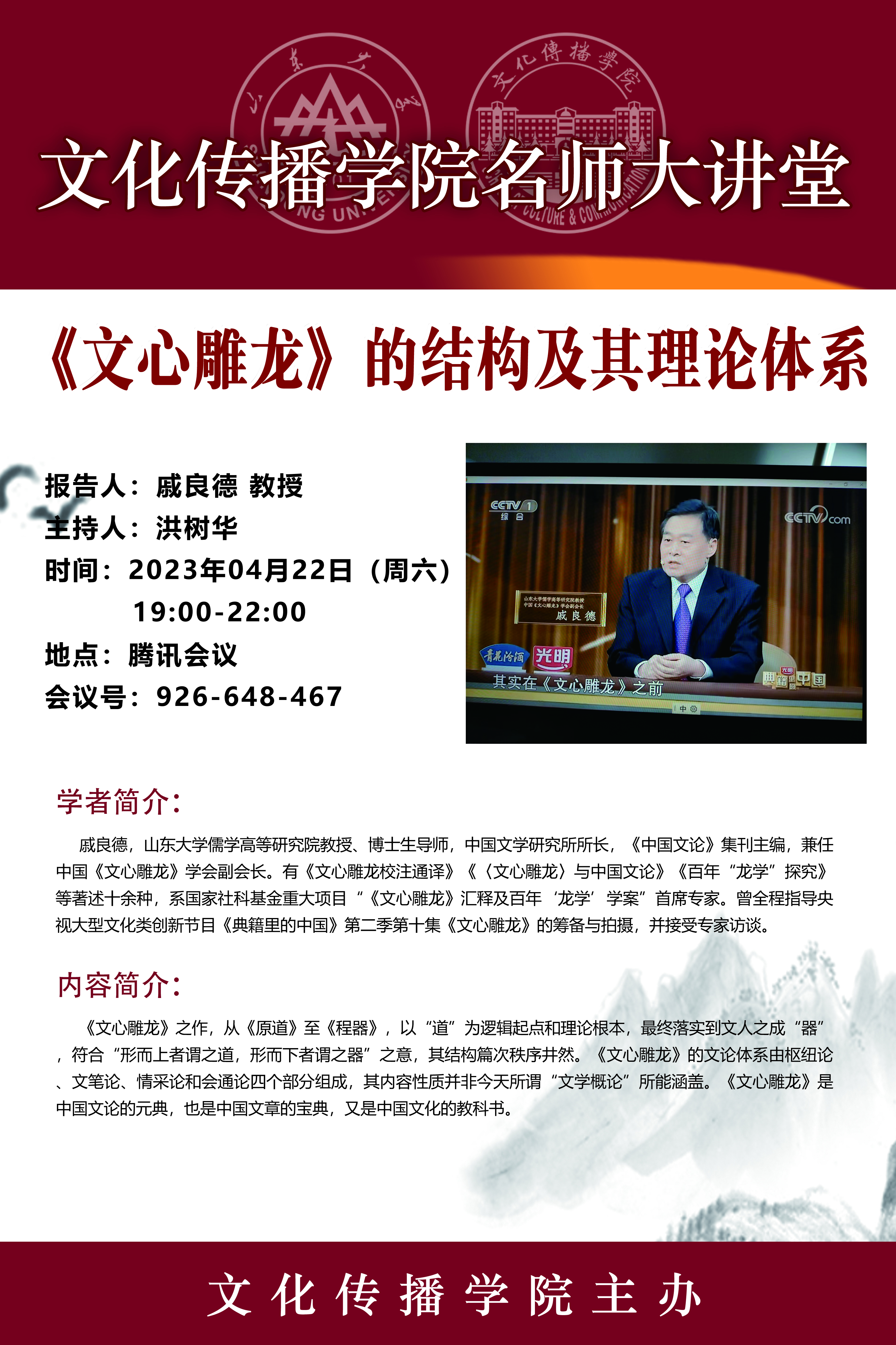 戚良德,万博MAX体育官网儒学高等研究院教授、博士生导师,中国文学研究所所长,《中国文论》集刊主编,兼任中国《文心雕龙》学会副会长。有《文心雕龙校注通译》《〈文心雕龙〉与中国文论》《百年“龙学”探究》等著述十余种,系国家社科基金重大项目“《文心雕龙》汇释及百年‘龙学’学案”首席专家。曾全程指导央视大型文化类创新节目《典籍里的中国》第二季第十集《文心雕龙》的筹备与拍摄,并接受专家访谈。