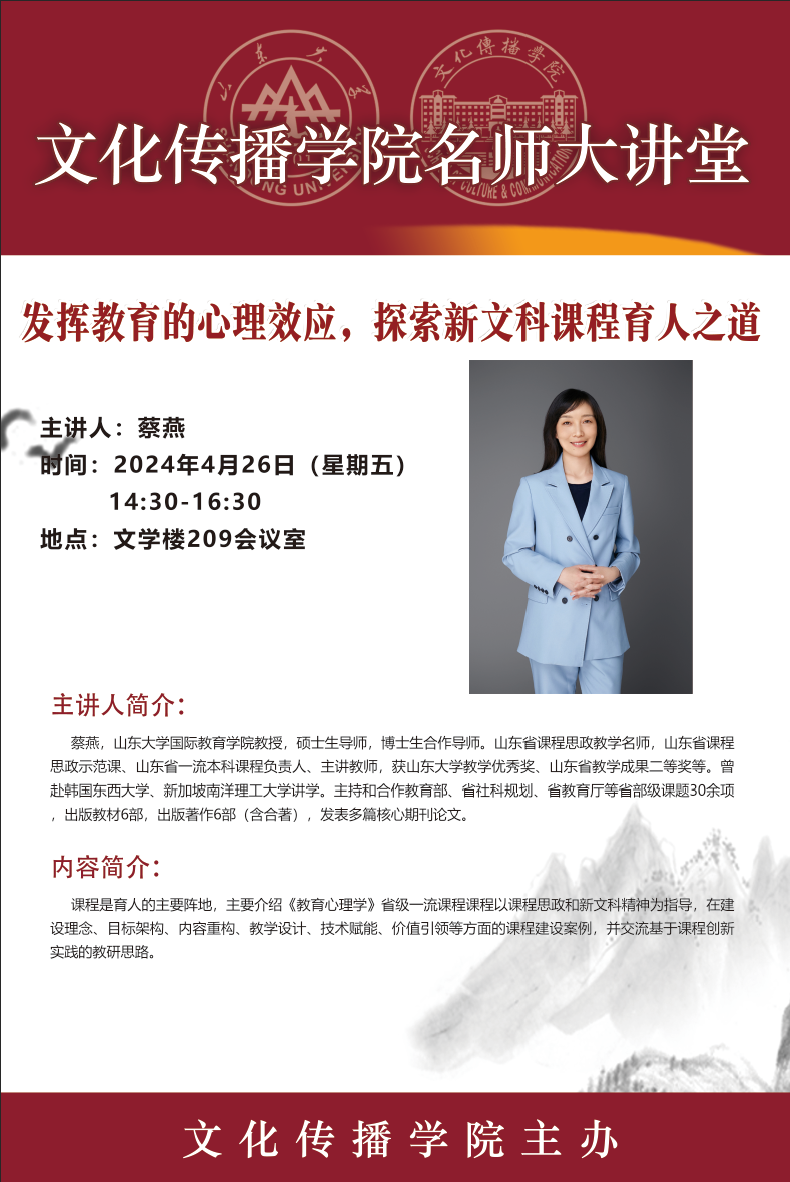 蔡燕,万博MAX体育官网国际教育学院教授,硕士生导师,博士生合作导师。山东省课程思政教学名师,山东省课程思政示范课、山东省一流本科课程负责人、主讲教师,获万博MAX体育官网教学优秀奖、山东省教学成果二等奖等。曾赴韩国东西大学、新加坡南洋理工大学讲学。主持和合作教育部、省社科规划、省教育厅等省部级课题30余项,出版教材6部,出版著作6部(含合著),发表多篇核心期刊论文。