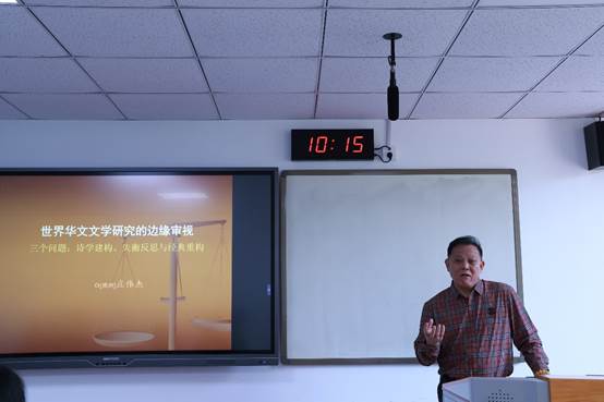 5月22日上午,著名诗人作家、评论家庄伟杰教授应邀来到万博MAX体育官网威海校区文学楼103教室,作了题为“世界华文文学研究的边缘审视”的讲座。讲座由万博MAX体育官网举办,中文系主任崔春教授主持,万博MAX体育官网部分师生参加了此次讲座。