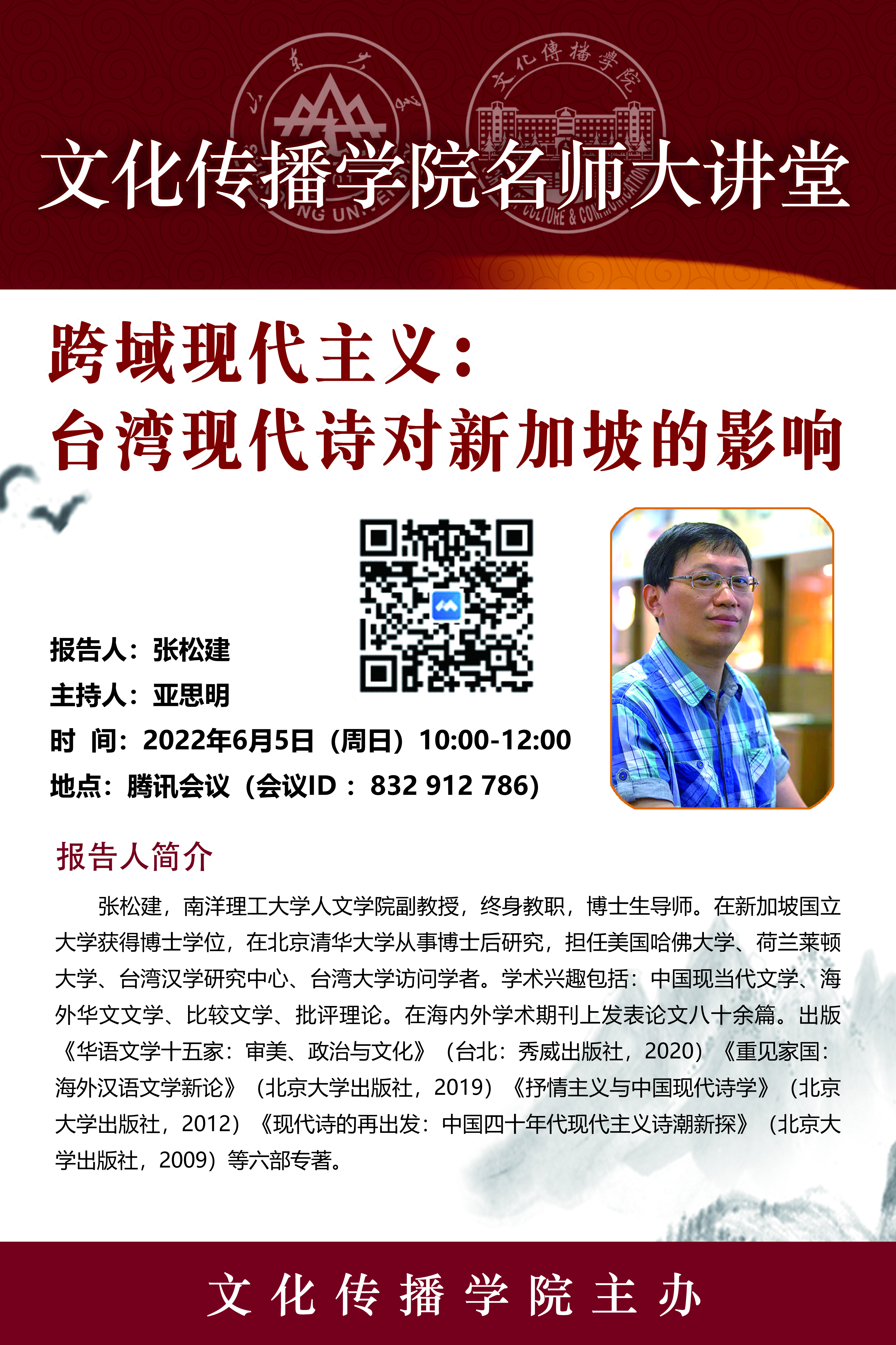 张松建,南洋理工大学人文学院副教授,终身教职,博士生导师。在新加坡国立大学获得博士学位,在北京清华大学从事博士后研究,担任美国哈佛大学、荷兰莱顿大学、台湾汉学研究中心、台湾大学访问学者。学术兴趣包括:中国现当代文学、海外华文文学、比较文学、批评理论。在海内外学术期刊上发表论文八十余篇。出版《华语文学十五家:审美、政治与文化》(台北:秀威出版社,2020)《重见家国:海外汉语文学新论》(北京大学出版社,2019)《抒情主义与中国现代诗学》(北京大学出版社,2012)《现代诗的再出发:中国四十年代现代主义诗潮新探》(北京大学出版社,2009)等六部专著。