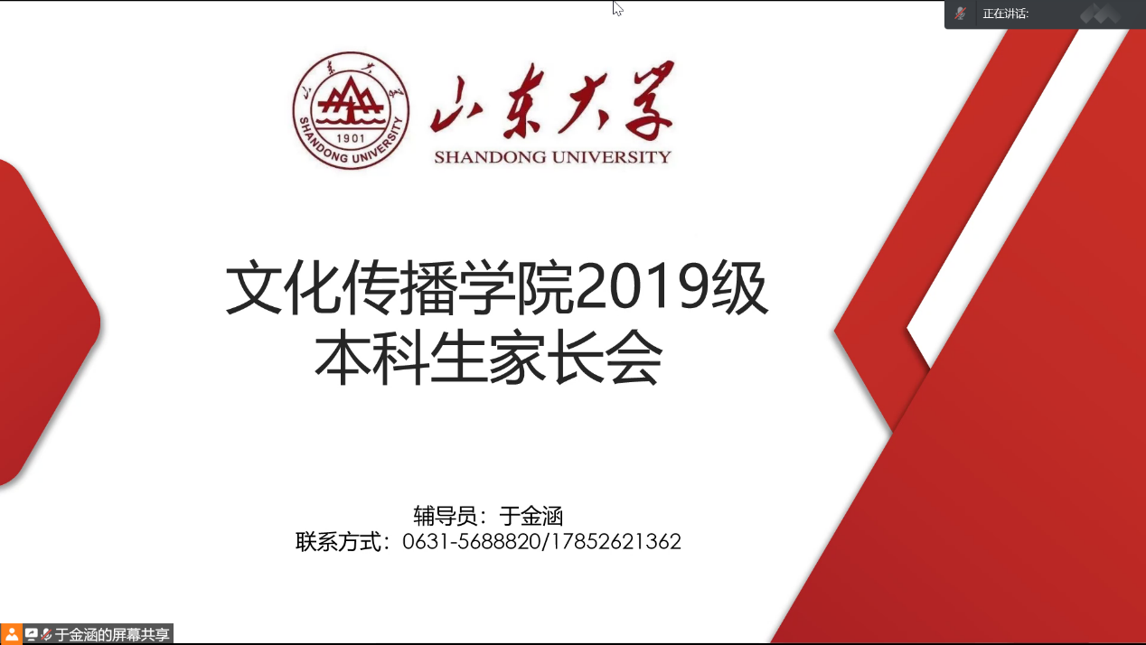 本次会议分为三个部分。会议伊始,于金涵向各位家长作了自我介绍,接着对疫情形势下学生请假制度作了详细说明。她向家长们准确传达了“非必要不离市”的原则,并介绍了请假流程。在第二部分中,于金涵向各位家长说明了学生成绩查询方法与考试情况,指出学分绩点的重要性,着重强调注意学生的学分绩点是否满足培养计划要求,并对家长们关心的保研问题作出回答。在第三部分安全教育主题中,于金涵从防诈骗、宿舍安全、心理健康这三个方面进行讲解。在防诈骗专题中,她提醒各位家长注意自身与学生的财产安全,谨防网络诈骗、电话诈骗等多种形式诈骗;讲到宿舍安全时,她提出希望家长监督学生注意防火防电、严禁将违禁物品存放在宿舍;最后,在心理健康方面,于金涵表示2019级很多学生正面临着保研、考研的压力,希望家长能与学院一同关注学生心理、情感状况,多途径帮助学生缓解焦虑。