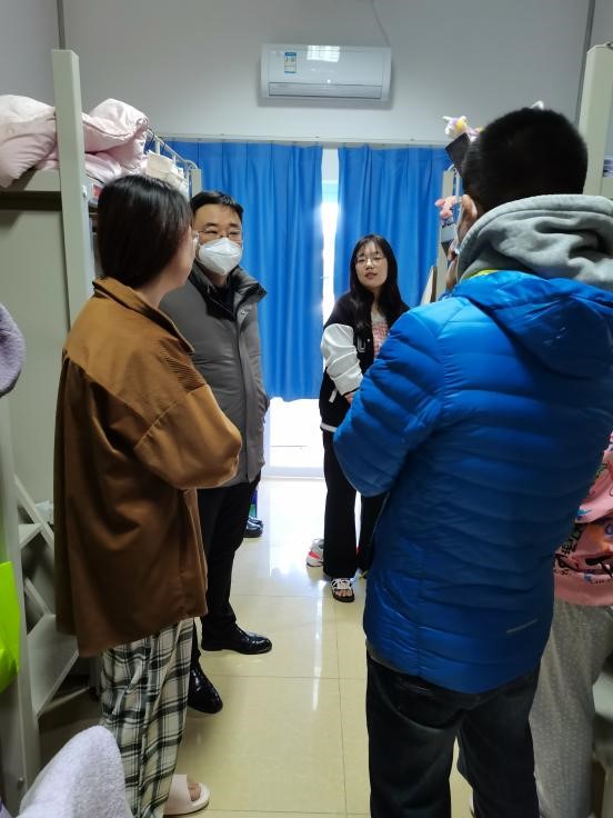 在走访近期因校园疫情防控而进行制动管理的部分女生宿舍时,魏斌一行详细了解了同学们目前的身体、生活和学习情况,解答了同学们提出的有关问题,在肯定同学们积极支持配合校园各项疫情防控的同时,再次向大家介绍了当前疫情防控的复杂形势,强调了做好校园疫情防控的必要性和重要性,同时鼓励同学们积极参加学校组织的各项活动,适当增强体育锻炼,关注身心健康,继续保持昂扬向上的精神风貌。随后,走访组来到了学院毕业生宿舍,详细了解了同学们的考研复试、毕业论文撰写、就业工作推进等重点信息,倾听了同学们升学备考、择业就业等的难忘经历,针对大家反映的在学习和生活中遇到的困难与问题,走访组一一进行了细致的解答,并鼓励同学们要严以律己、有条不紊、保质高效地完成毕业季的各项工作,走访组还叮嘱同学们在遇到问题和困难时,可以第一时间通过“书记直通车”等途径向学院反映,方便学院及时准确地为大家解决困难和个性化需求。